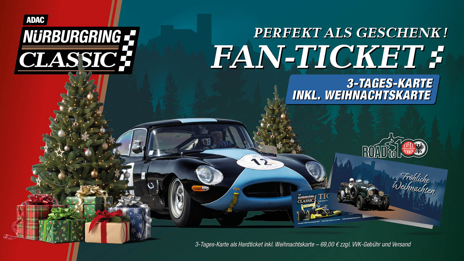 Verschenken Sie pures Racing-Feeling: Das exklusive und limitierte Fan-Ticket der Nürburgring Classic 2026 kommt hochwertig gedruckt per Post – inklusive kostenloser Weihnachtskarte. Ideal, um etwas Besonderes unter den Baum zu legen.